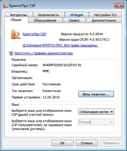 - Откройте настройки КриптоПро (Пуск - Панель управления - КриптоПро CSP) и нажмите "Ввод лицензии"